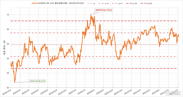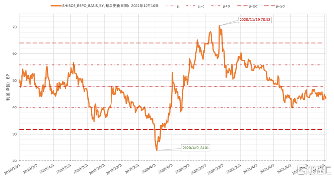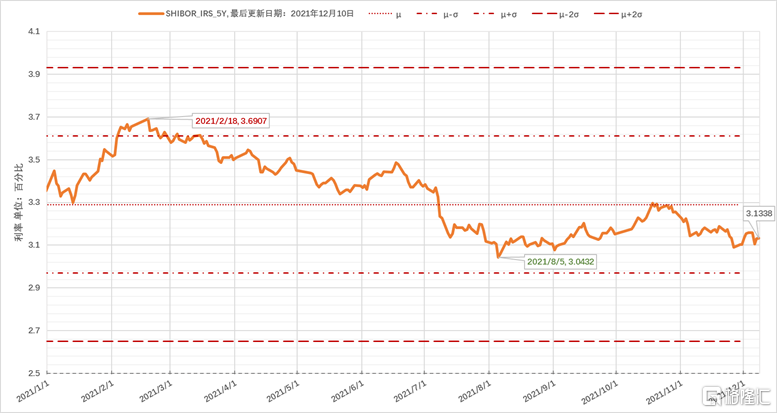 5年期SHIBOR 3M利率互換全年變動幅度爲3.04%~3.69%(共計65BP),近三年標準差爲0.3227。當前固定端利率爲3.1038%,與2020年7月利率水平較爲相近,從過去三年的統計數據來看,約在15.0%的歷史分位水平。