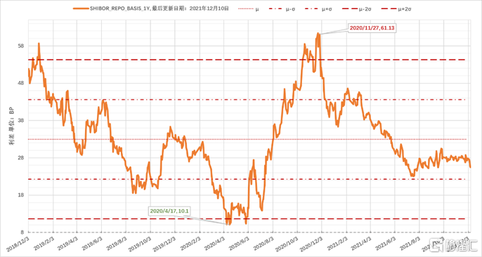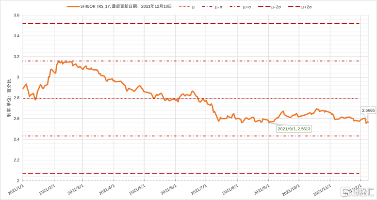 1年期SHIBOR 3M利率互換全年變動幅度爲2.56%~3.16%(共計60BP),近三年標準差爲0.3618。當前固定端利率爲2.575%,與2020年7月利率水平較爲相近,從過去三年的統計數據來看,約在13.5%的歷史分位平。