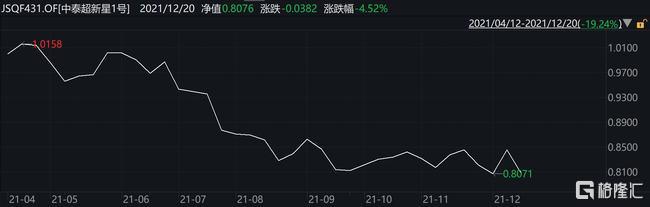 根據Wind數據顯示,截至2021年12月20日,中泰超新星1號的單位淨值為0.8076元,回撤19.24%。從其淨值表現來看,中泰超新星1號在4月19日單位淨值高達1.0158元,隨後下跌。可以看到這隻私募基金走勢很慘,表現出來的成績並沒有像他寫的研報那麼靚麗。