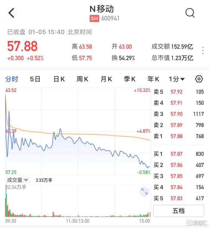 今日,“巨無霸”中國移動(600941.SH)正式迴歸A股,上市首日開盤報63元/股,高於發行價57.58元/股。截至收盤,股價收漲0.52%,報57.88元/股,總市值1.23萬億元。