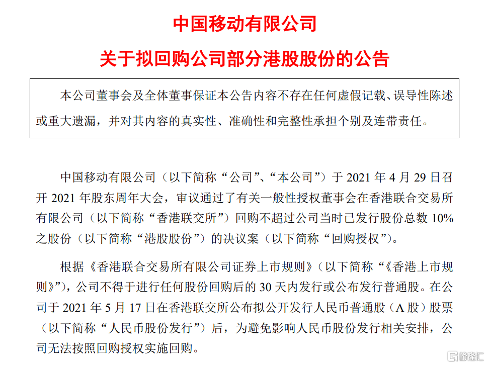1月4日晚,中國移動發佈公告稱將在港股啓動回購,公司擬回購不超過20.48億股港股股份,相當於不超過2021年股東周年大會當日公司已發行港股股份總數的10%。根據香港《公司條例》,其回購的港股股份將視爲在回購時被註銷。按1月4日收盤計算,10%股權市值價值爲982港元。