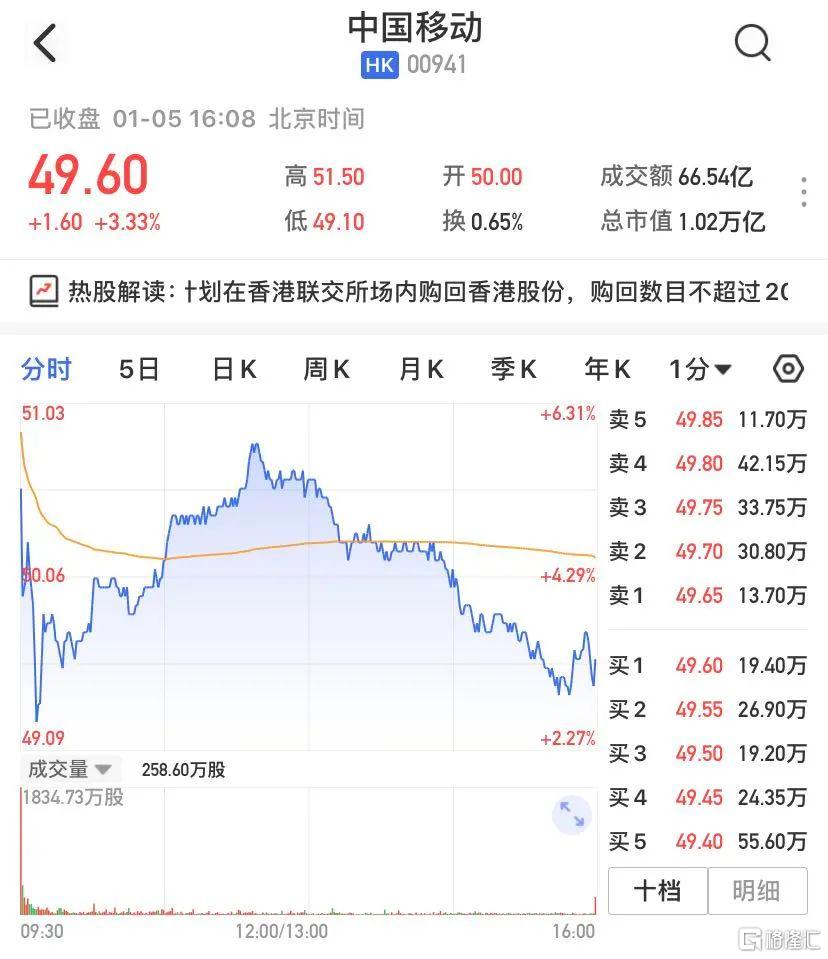 受消息面影響,今日開盤,港股中國移動(0941.HK)股價高開漲超5%,截至收盤,收漲3.33%,報49.60港元/股,總市值1.02萬億港元。