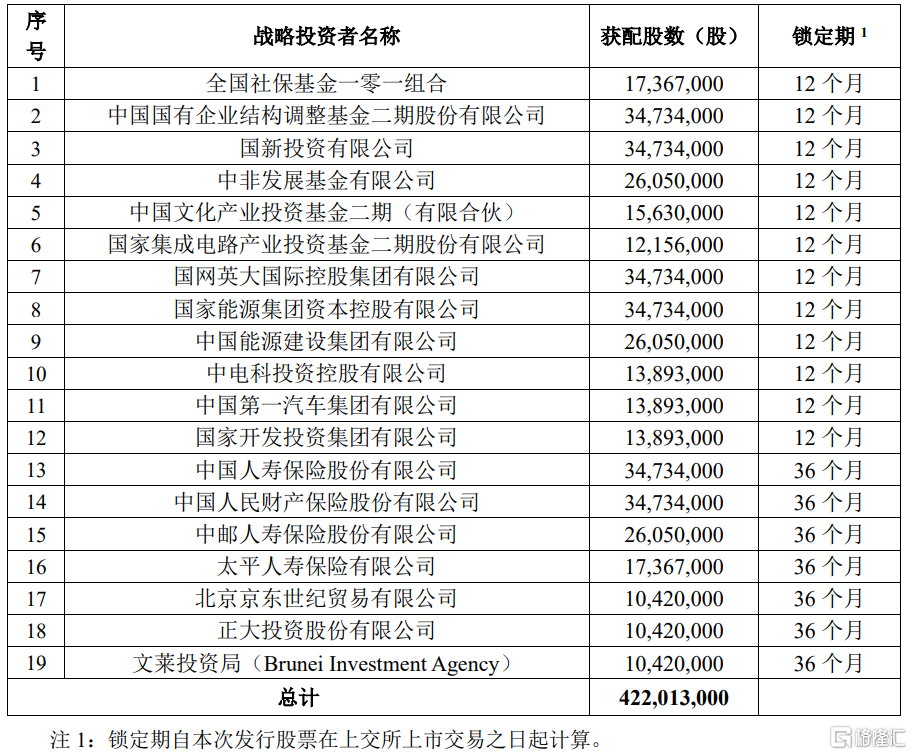 其次是中國移動本次IPO實施了戰略配售,一方面引進了19家戰略投資機構,涵蓋了全國社保基金、國家集成電路產業投資基金二期(國家大基金)、國家能源集團等。另一方面引入綠鞋保護機制,一定程度上維護了股價穩定。