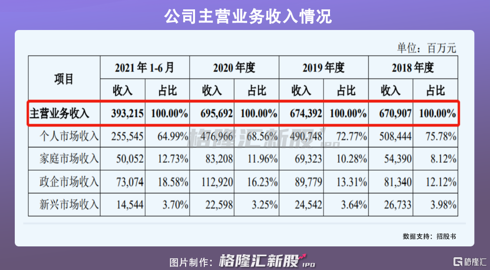 中國移動主營業務分爲四個部分:個人市場、家庭市場、政企市場、新興市場。其中,個人市場業務是公司主要收入來源,近三年半佔營收比重超過60%以上。