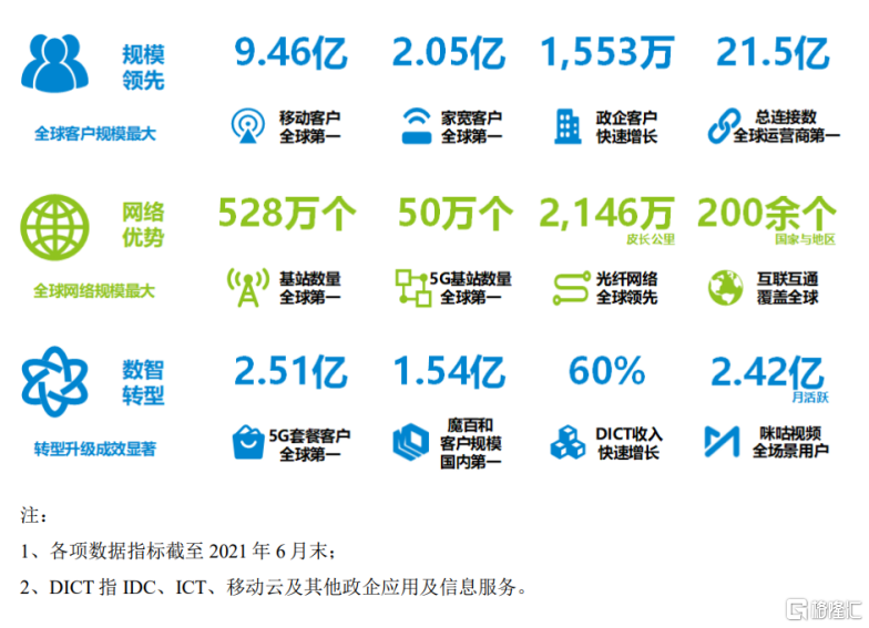 同時,中國移動用戶數增長較爲強勁。截至2021年6月末,公司共有9.46億移動客戶、2.05億家庭客戶、1553萬政企客戶。其中,移動客戶和家庭客戶用戶數均居全球第一。