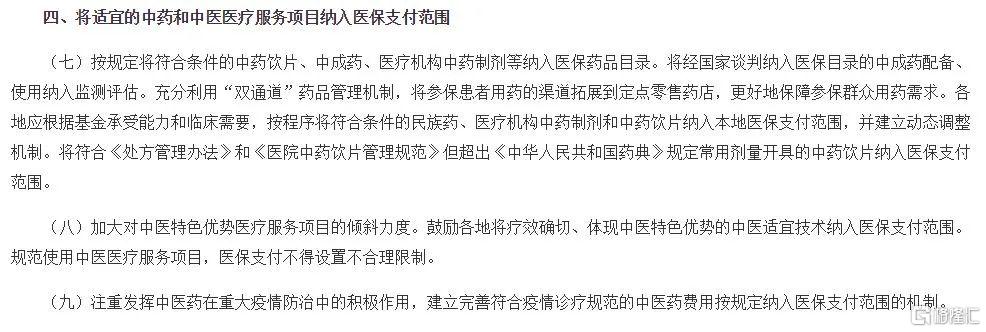 《關於醫保支持中醫藥傳承創新發展的指導意見》提出,規定將符合條件的中藥飲片、中成藥、醫療機構中藥製劑等納入醫保藥品目錄。