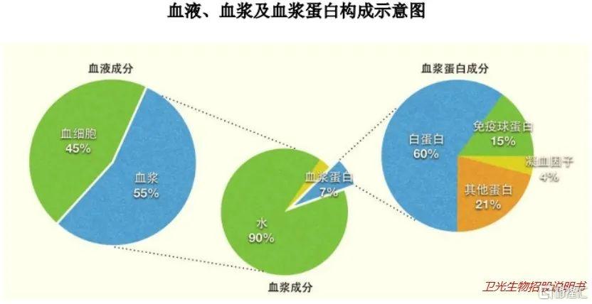 人類血液中血漿佔比約55%,血漿中90%為水分,蛋白質僅佔7%。在蛋白質中,白蛋白佔比60%、免疫球蛋白佔比15%、凝血因子佔比4%,其他蛋白佔比21%。