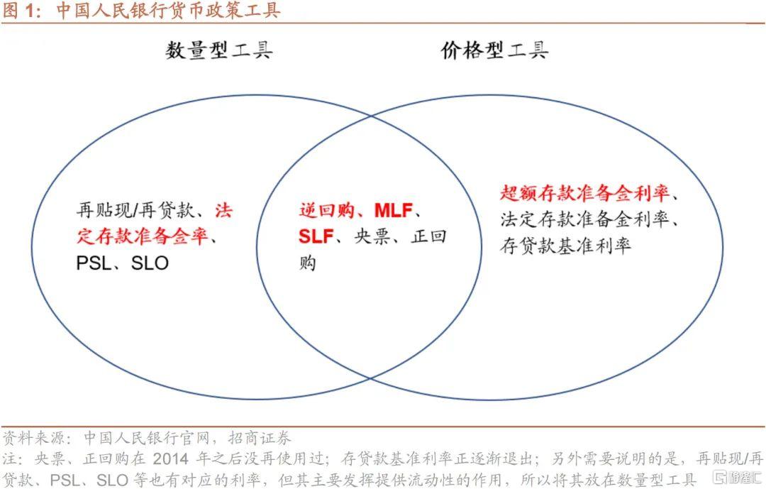 價格型工具則主要是各類政策利率,目前常用的政策利率主要包括逆回購利率和MLF利率,此外,存貸款基準利率是以前的基準政策利率,還有SLF利率、法定/超額存款準備金利率等。
