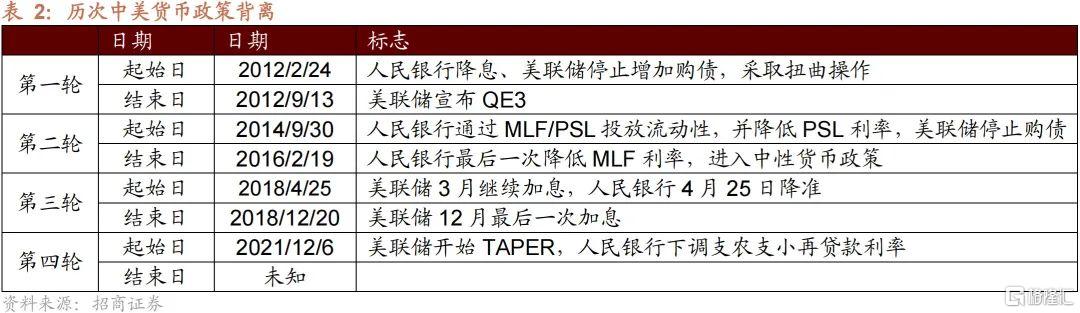 本輪背離按照我們的標準,始於2021年12月15日,美聯儲宣佈加速Taper並對加息給予明確的指引,而中國央行也降準和調降了部分政策利率,中美貨幣政策正式進入背離期。