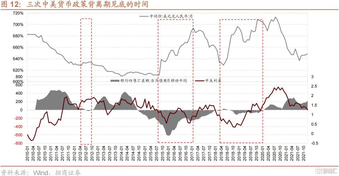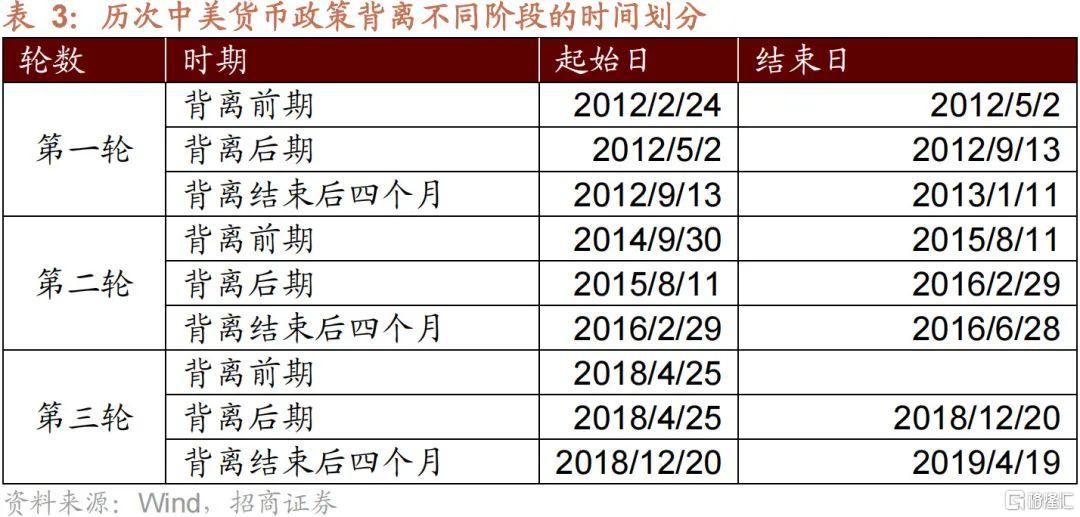 2012年以來中美兩國貨幣政策出現過三輪內鬆外緊的背離,分別是2012/2-2012/9、2014/9-2016/2、2018/5-2018/12。回顧三輪中美貨幣政策背離可以發現: