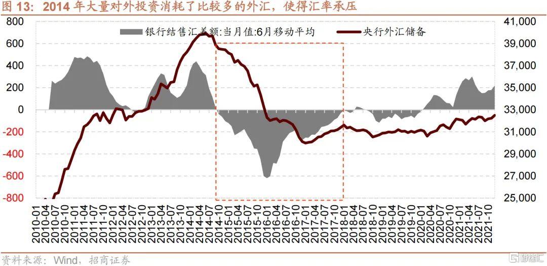 2014年9月開始,中國開始通過MLF和PSL大規模投放流動性,彼時貿易順差仍然很高,但是銀行結售匯大幅回落,大量國內資金通過企業換匯後流出中國,這與當時“一帶一路”和“走出去”戰略有很大的關係。因此,人民幣匯率自2014年10月開始就有貶值壓力,但是央行持續在外匯市場上賣出美元,買入人民幣,使得匯率穩定,但是這一操作消耗了大量的外匯。2015年7月之後,隨着中國利率水平快速下行,美國卻醖釀加息,中美利差持續回落掉到125BP以下,更大的貶值壓力也促使了“811”匯改的發生。