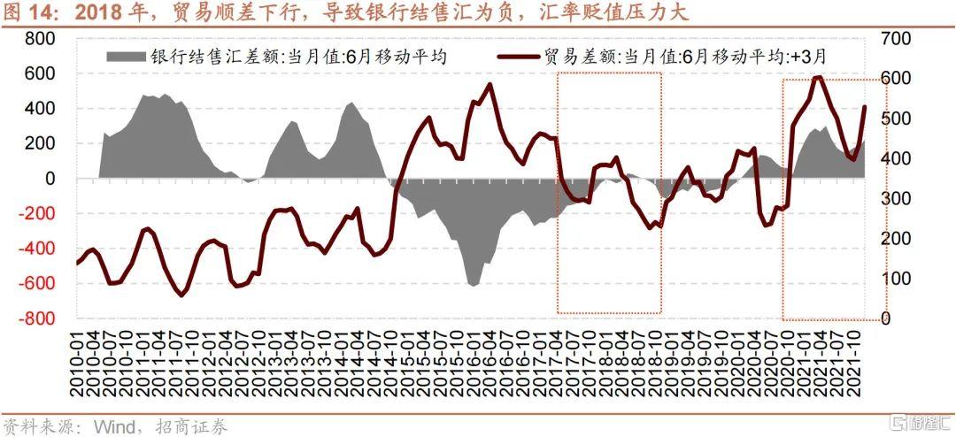 而2018年,中美貿易摩擦逐漸升温,中國出口開始受到挑戰,中國的貿易順差開始減少,銀行結售匯繼續保持負,與此同時,4月下旬開始的降準使得中美貨幣政策背離,中美利差掉到100BP以下,結售匯為負,利差縮窄,使得人民幣匯率自2018年四月開始再度大幅貶值。