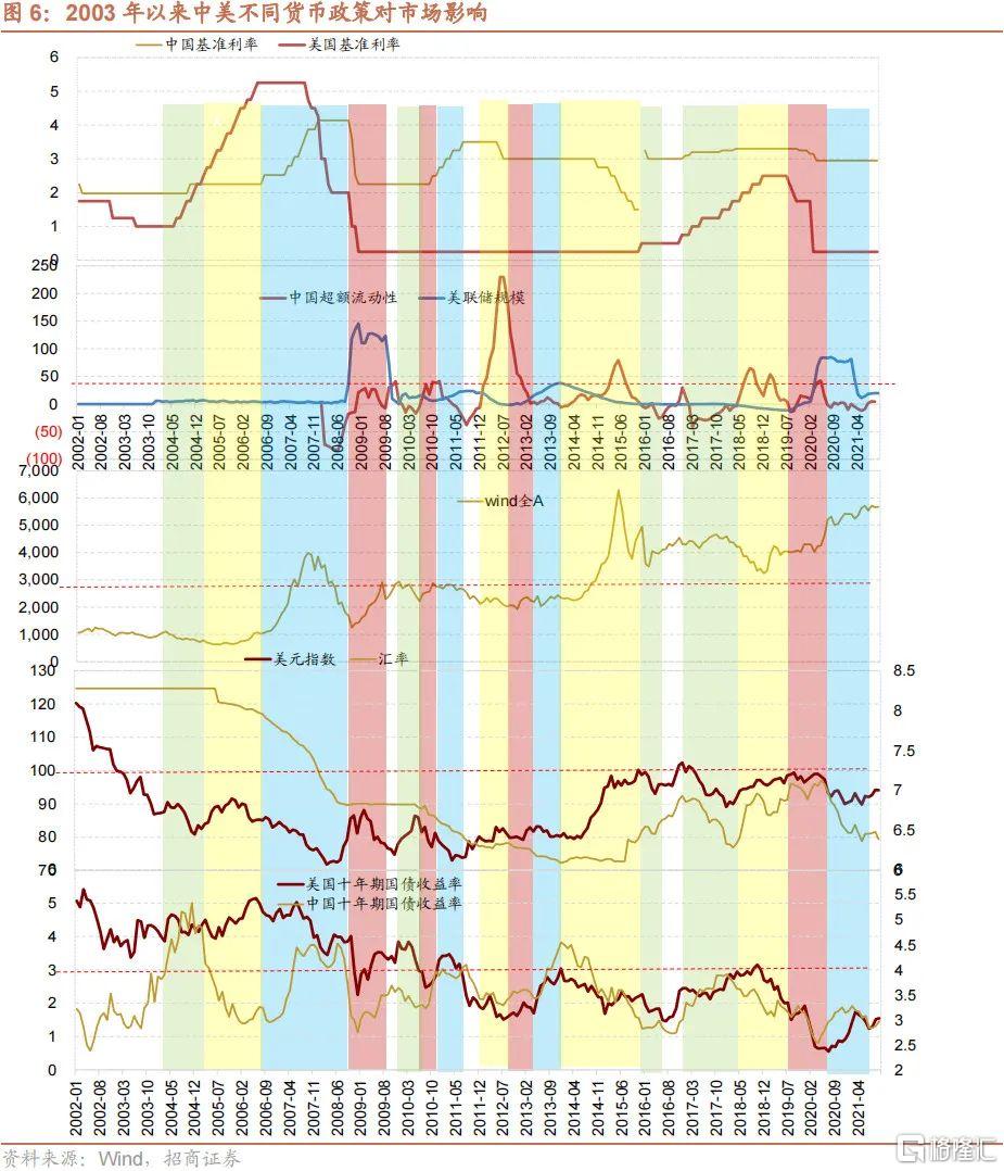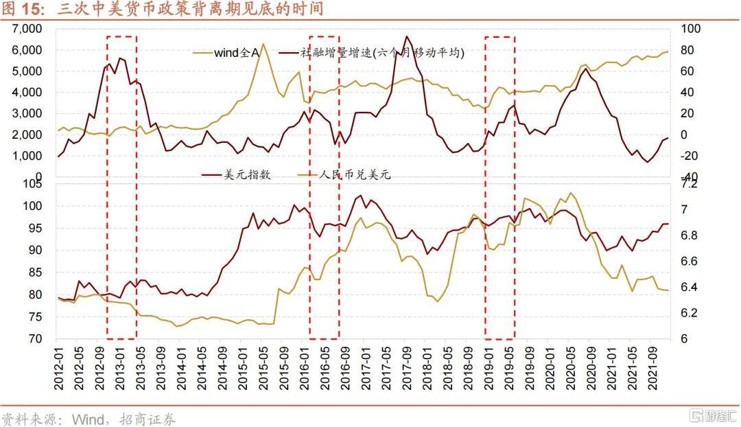 5、2021年12月以來國內降準降息,而美國則從Taper到加速Taper,3月美聯儲加息預期強烈,新一輪中美貨幣政策背離已經開啟,5月前後可能成為A股見底的關鍵時點。本輪中美貨幣政策背離過程中,3月美聯儲開啟加息幾成定局,之後如果美元指數大幅走弱可能意味着市場對美聯儲5月或6月加息的預期在降低;一季報公佈後業績加速下滑的不利因素釋放;鑑於3月召開兩會,5月公佈的4月社融數據可能超預期上行。綜合以上因素,本輪調整結束很可能發生在5月。