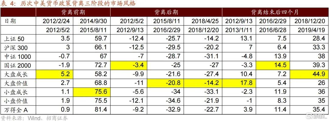 3、根據分水嶺指標和見底信號的出現,可以將三輪背離行情分為背離前期、背離後期、背離結束後的反彈期。背離前期在寬鬆貨幣政策助推下A股上漲,其中成長風格表現更好;當匯率貶值、基本面惡化的分水嶺出現,進入背離後期,A股下跌,2012年是小盤股相對抗跌,而2015年、2018年都是大盤價值相對抗跌。隨着背離結束,A股滯後觸底反彈,但風格不定。