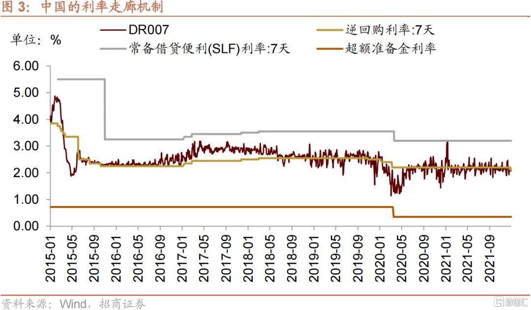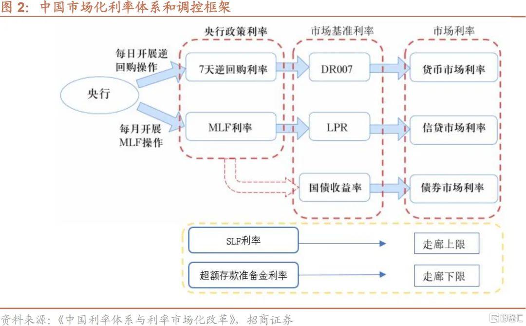 經過近30年的利率市場化改革,我國目前已經基本形成了比較完整的市場化利率體系,同時也實現了從政策利率向市場利率的傳導機制。央行探索構建利率走廊機制,SLF(常備借貸便利)利率為走廊上限,超額準備金利率(央行對金融機構存放在央行的超額準備金付息的利率)為理論下限,7天逆回購利率和MLF利率發揮了不同期限利率錨的作用,以收窄利率波動範圍,形成“利率走廊+政策利率”的調控框架,增強央行政策利率對市場利率的調控能力。