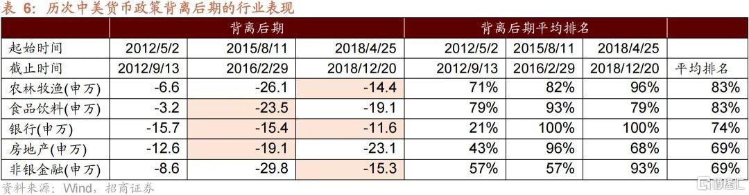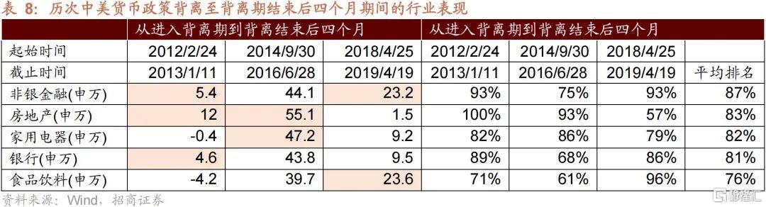 4、從行業來看,從背離期到背離期結束後四個月這一年多左右的時間裏,以金融、地產、家電、食品飲料等板塊表現佔優。背離前期平均表現比較好的是地產、建築、交運、非銀等低估值板塊;背離後期,相對抗跌的是農林牧漁、食品飲料等偏必需消費,以及金融地產等低估值;背離期結束後,反彈相對佔優的是可選消費、非銀金融、電力設備、國防等成長性板塊。