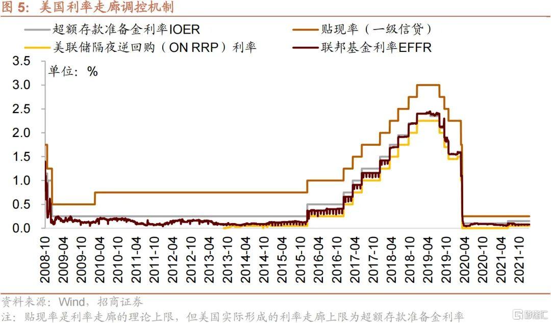 理論上,貼現率為利率走廊上限,IOER為走廊下限。但是金融危機後,QE影響下,市場流動性寬鬆,金融機構在貨幣市場和美聯儲之間進行套利,機構將閒餘資金以低於IOER的利率拆借給銀行,銀行再存入美聯儲獲得超額存款準備金利息,由此IOER成為利率上限。與此同時,美聯儲通過隔夜逆回購回收市場短期流動性,如果市場利率低於隔夜逆回購利率,市場會更願意參與美聯儲的隔夜逆回購,導致市場資金供給減少,利率抬升,那麼隔夜逆回購就發揮了利率底的作用。所以可以看到,金融危機後,美國實際形成了IOER為頂、ON RRP利率為底的利率走廊,美聯儲通過公開市場操作等工具對聯邦基金利率進行調控。