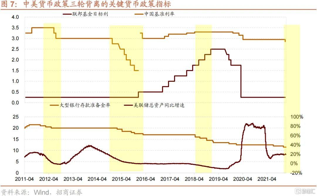 從圖上可以看到,中美貨幣政策在2005年,2012年,2014~2015年,2018年均出現過中國貨幣政策走向寬鬆,美國走向緊縮的背離。