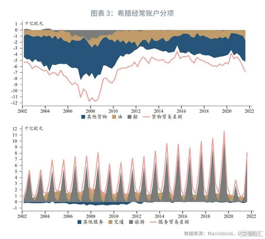 希臘方面,旅遊業和航運業是其兩大支柱行業。2007年,希臘旅遊業產值約佔GNP的15%,爲希臘創造了大量的外匯收入及就業機會。然而,由於製造業薄弱,希臘只能通過大量進口油類及船類產品爲服務業提供支撐。在希臘的經常賬戶中,服務貿易順差,貨物貿易逆差。在2013年以前,貨物貿易赤字水平要高於服務業帶來的出口紅利,導致希臘常年處於貿易逆差的狀態。2008年金融危機更是對旅遊業和航運業造成巨大沖擊,行業收入大幅縮水,使得貿易逆差進一步擴大。貿易赤字加劇了國民經濟失衡的狀況,希臘越來越多地依賴於資本金融賬戶順差。