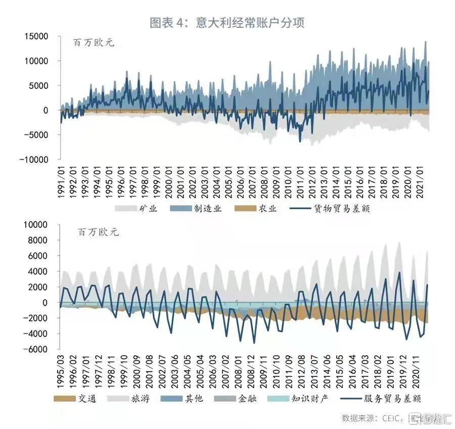 意大利則爲另一類典型的代表。與希臘落後的產業結構不同的是,意大利具有較發達的工業水平,尤其是機械及化學工業,其中紡服類產品的出口常年居於世界首位。然而,意大利是一個礦產資源匱乏的國家,自有礦產遠不能滿足工業運作需求,因此對礦產品進口具有較高的依賴度。歐債危機前,意大利礦產品的進口需求一度拖累貨物貿易差額陷入負值,而服務貿易更不是意大利主要的出口收入來源,這同樣導致了意大利的經常賬戶長時間處於逆差狀態。