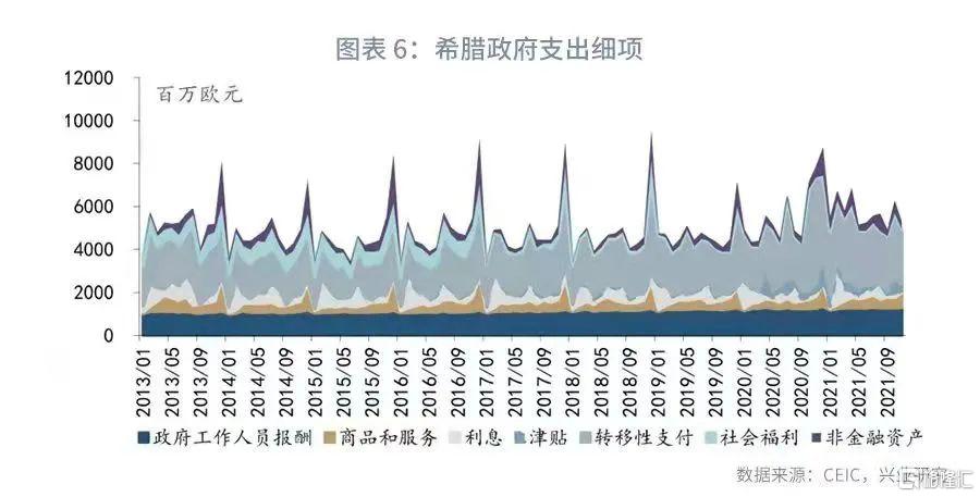 財政方面,各國的政策方向從債務危機時期爲了簡單的控制債務和赤字水平而採取緊縮性政策,轉向爲促進經濟復甦、創造收入而採取擴張性政策。得益於歐盟及時實施的《穩定與增長公約》(簡稱《公約》)免責條款,各成員國政府在本次危機後能盡其所能加大財政刺激力度助力經濟復甦。儘管債務水平進一步擡升,但強有力的經濟增長勢頭並未讓信用危機再次發生。另外,從希臘的政府支出結構來看,雖然受疫情影響轉移性支出依然較多,但社會福利分項的支出已大幅減少,總體結構已有所改善。除此之外,自2014年以來,希臘政府的債務中以非歐元計價的債務已顯著降低,減輕外幣債務負擔。