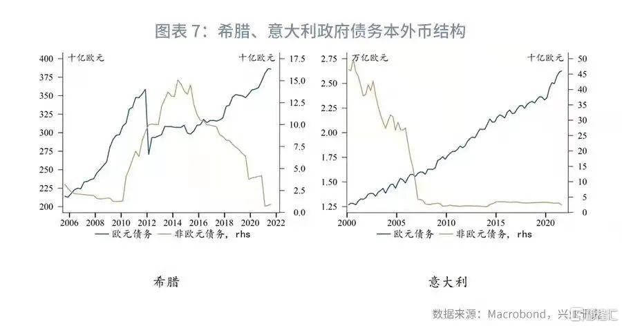 好在從希臘和意大利的本外幣債務結構來看,以歐元以外貨幣計價的債務在2008年前逐年下降且處於相對低位。在希臘國債評級被下調後,歐元在歐央行政策利率的調控下並未出現明顯貶值,意大利的外幣債務仍保持較低水平,而希臘外幣債務上漲的主要原因則爲國債利率跳升。
