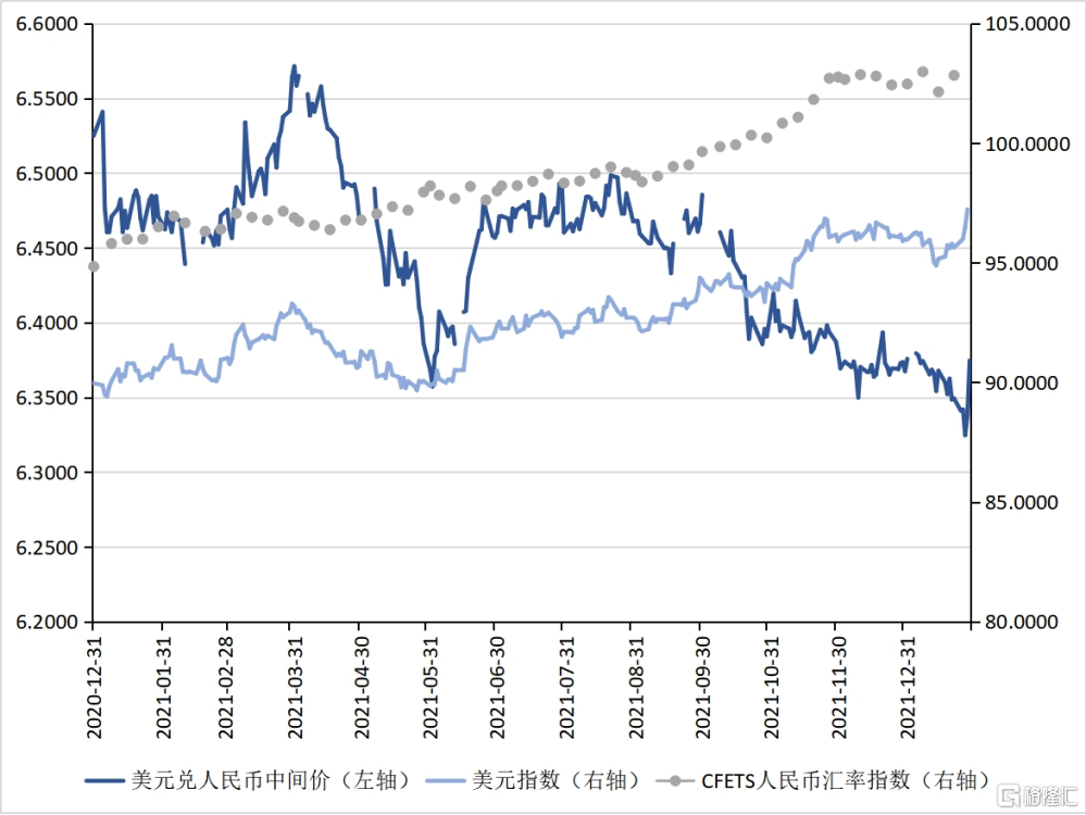 2021年,人民幣兌美元匯率的運動大致可以劃分爲如下兩個階段:第一個階段是2020年12月31日至2021年9月30日,人民幣兌美元匯率與美元指數之間呈現顯著的負相關性。在這個階段內,當美元指數下行時,人民幣兌美元匯率升值,反之亦然。第二個階段是2021年9月30日至2021年年底,人民幣兌美元匯率與美元指數呈現出雙雙上漲格局。2021年9月30日至2021年12月31日,美元指數由94.2638 上升至95.9701 ,升值了1.8%;同期內,人民幣兌美元中間價則由6.4854上升至6.3757,升值了1.7%。