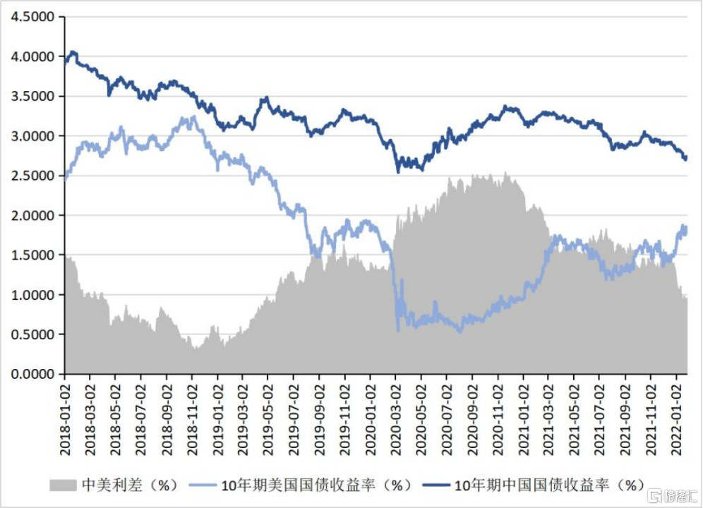 與美債收益率上行形成鮮明對比的是,10年期中國國債收益率在2021年呈現波動中下降的趨勢(見圖10)。2021年1月4日至2021年12月31日,10年期中國國債收益率從3.1713%下降至2.8352%,下降了33個基點。同期中美10年期國債收益率利差從2.2413%收窄至1.3152%。伴隨着中國央行在2021年12月以來的加息節奏,10年期中國國債收益率在2022年1月25日更是一度降至2.6938%。中美利差縮小會影響到短期跨境資本流動,進而影響人民幣匯率交易需求,從而影響到人民幣匯率走勢。短期來看,中國會面臨一定的資本外流的壓力。