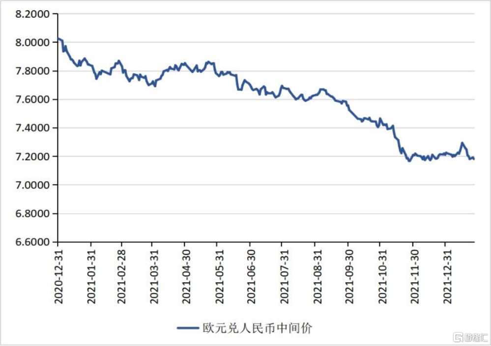2021年,人民幣兌歐元匯率走勢表現出在波動中升值的態勢(見圖2)。2020年12月31日至2021年12月31日,人民幣兌歐元匯率中間價由8.0250上升至7.2197,總體上升值了10%。