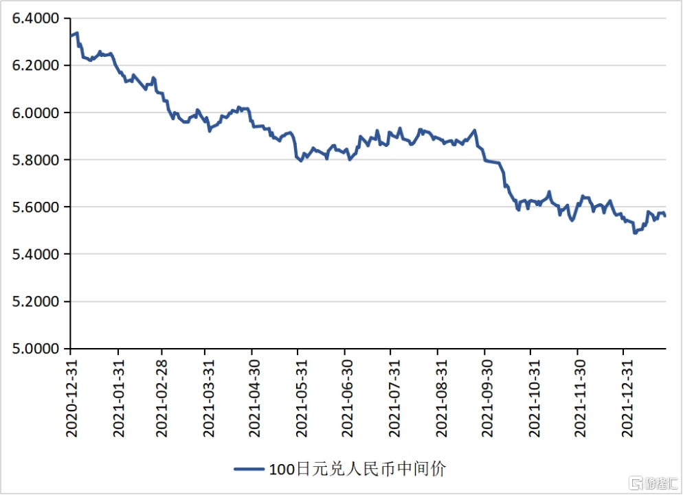 2021年,人民幣兌日元匯率的運動大致可以劃分爲如下三個階段:第一個階段是2020年12月31日至2021年6月4日,在這個階段內,人民幣兌日元匯率表現出升值的趨勢,總體上升值了8.1%;第二個階段是2021年6月4日至2021年9月22日,在這個階段內,人民幣兌日元匯率呈現出小幅波動特徵,人民幣兌日元匯率在5.8至5.9的區間內小幅波動;第三個階段是2021年9月22日至2021年年底,在這個階段內,人民幣兌日元匯率轉爲快速升值趨勢,該階段總體漲幅爲6.4%。