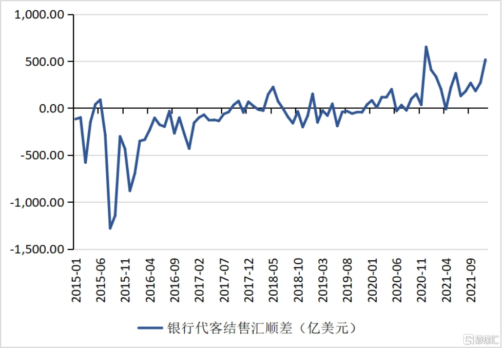 原因之二:由於新冠疫情後中國經濟的復甦早於其他國家,且中國長期利率顯著高於主要發達經濟體,導致中國對短期資本流動的吸引力較強。貨物貿易順差加上跨境資本流入,使得總體上中國面臨跨境資本淨流入。例如,2021年7月至9月的銀行代客結售匯順差分別爲129、181與268億美元,3個月累計578億美元,顯著高於2020年同期的107億美元以及2019年同期的-132億美元。在2021年12月,銀行代客結售匯順差更是高達516億美元(見圖5)。跨境資本淨流入意味着國內外匯市場上美元供過於求,這也會推動人民幣兌美元匯率的升值。