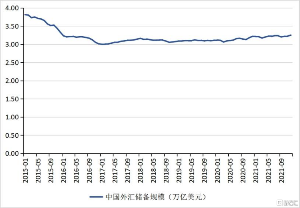 原因之三:中國外匯儲備規模穩中有升,增強了國內外投資者對人民幣匯率的信心。2017年至2020年,中國外匯儲備的月度平均規模分別爲3.07、3.11、3.10、3.13萬億美元(見圖6)。2021年1月至10月,中國外匯儲備的月度平均規模達到3.21萬億美元,顯著高於之前數年的平均水平。尤其值得一提的是,由於2021年年初至今美元指數總體走強,這會對中國外匯儲備形成負向估值效應。在這一背景下,2021年12月中國外匯儲備規模高達3.25萬億美元,這是自2016年1月以來的新高,這說明外匯儲備的流量增長可能更快。