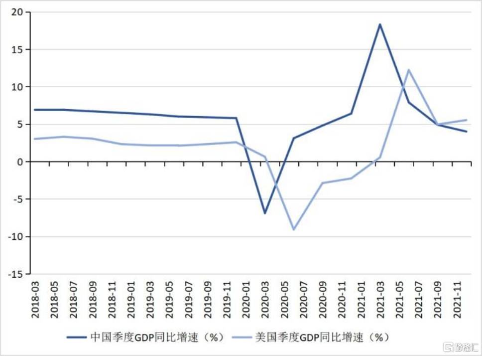 2021年美國GDP增速爲5.7%,中國GDP增速爲8.1%。餘永定(2022)指出,如果扣除基數效應,中國2021年的經濟是運行在低於2019年6%的水平。2022年1月,IMF最新一期《世界經濟展望》將美國2022年GDP增速從5.2%下調至4%,這主要是考慮到美國國會通過“重建美好未來”法案一攬子財政措施的可能性下降,當局更早退出非常規寬鬆貨幣政策,以及經濟面臨持續的供給擾動。同時,IMF考慮中國房地產部門持續收縮,且私人消費的復甦弱於預期,將中國2022年的GDP增速從5.6%下調至4.8%。