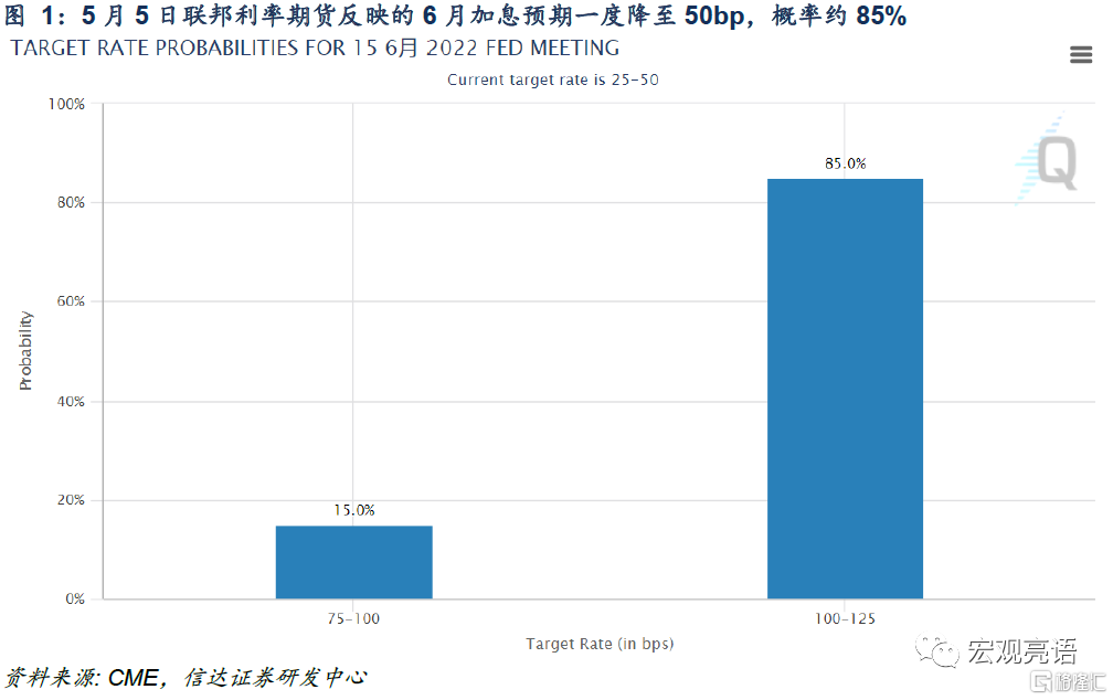 5月議息會議美聯儲如期加息50bp,引導市場消除下次會議加息75bp的憂慮。會議開始前,市場對於本次加息已有充分預期,鮑威爾堅定表態要對通脹採取強硬行動,必要時不惜一次加息50個基點。上週,聯邦利率期貨顯示的5月會議加息50bp概率就已突破90%。在美聯儲高官多次鷹派講話的引導下,市場加息預期不斷升溫,一度預期6月議息會議將一次加息75bp。鮑威爾在新聞發佈會上消除了市場的疑慮,表明FOMC未考慮加息75bp的選項(75bp increase is not something the committee is actively considering),但接下來的會議很可能多次加息50bp (50bp increases should be on the table at the next couple ofmeetings)。