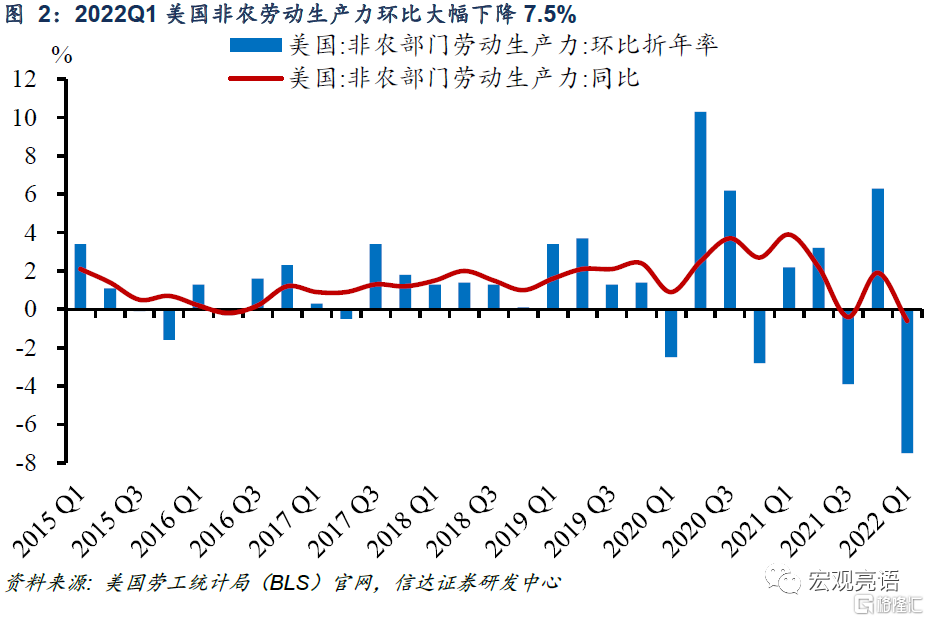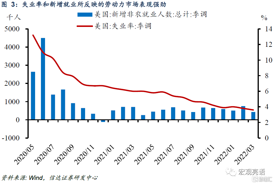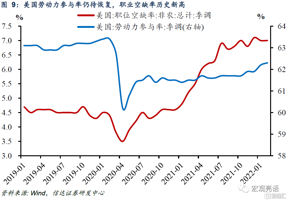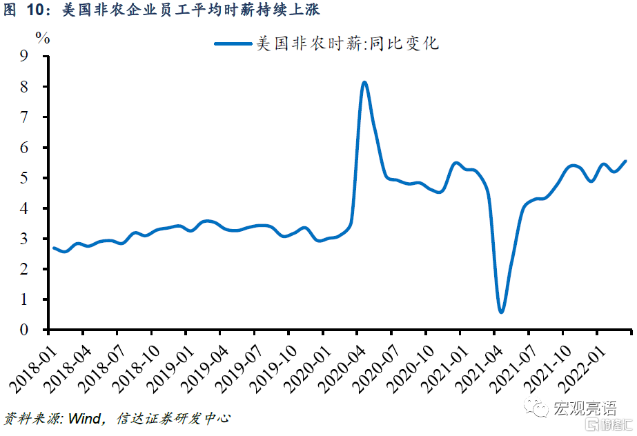 最後是疫情後出現的勞動力短缺問題,以及由此造成的工資-通脹螺旋問題。出於對疫情傳播的擔憂和疫情救助等原因,疫情後大批美國人退出勞動市場,勞動參與率大幅低於疫情前水平。截至2022年3月,美國勞動力參與率爲62.4%,比疫情前(2020年1月)仍低了1個百分點,就業人數至今仍未回到疫情前。美國杜克大學CFO調查顯示,74%的受訪公司CFO們表示他們在填補職位空缺方面遇到了困難,作爲應對措施,其中82%的公司將它們的起薪平均提高了9.8%。截至2022年3月,美國私人非農企業員工平均時薪同比增長5.6%,連續9個月增速超過4%,可以說,美國工資-通脹螺旋已經形成。5月5日美國勞工統計局發佈數據,2022Q1非農勞動生產力環比下降7.5%,4月30日當週初次申請失業金人數升至20萬人,勞動力短缺問題在加劇,我們的判斷進一步坐實。