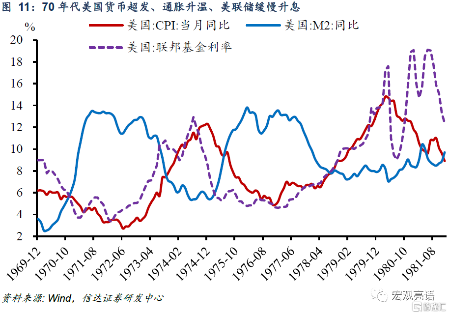 整個70年代,歷任政府更加擔憂經濟衰退,對高通脹的危害性認知不足。第一次石油危機後,福特政府採取了偏緊的貨幣政策,到1975年初,將M2增速控制到5%的低位,通脹隨後有所滑落。卡特政府上臺前通脹一度降至4.9%,遂再次將就業擺在首位,上任伊始就放棄了國會的抗通脹工具——工資和價格控制,埋下了高通脹的種子。而1978年“充分就業和平衡增長法案”明確要求保持長期增長的貨幣總量以實現充分就業進一步打開了通脹的大門。時任聯儲主席伯恩斯和其繼任者米勒則將美聯儲武裝成了白宮政策的執行者,面對通脹,伯恩斯和米勒採取緩慢升息的舉動,甚至多次因忌憚拖累經濟復甦而不敢加息。結果不言而喻,溫和的加息步伐不但對就業市場造成了損害,也沒能有效控制通脹,還嚴重損害了公衆對聯儲的信心。