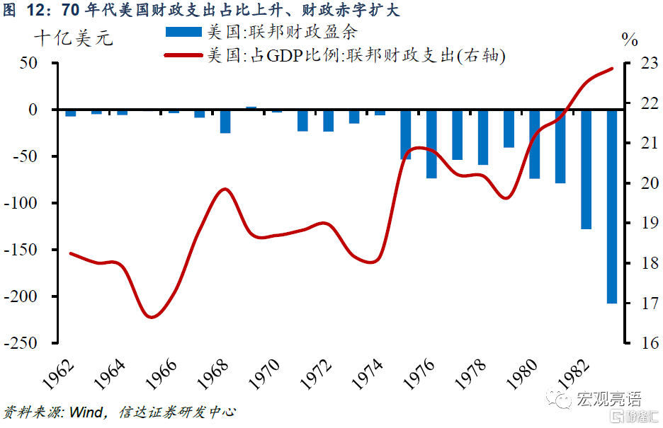 造成70年代美國高通脹的基礎是二戰後美國政府長期奉行凱恩斯主義,貨幣財政雙寬鬆。二戰後美國經濟快速增長,60年代M2穩定以接近8%的增速擴張,1965年後CPI增速持續上行,70年代初已突破6%,培育了通脹升溫的土壤。冷戰背景之下,1965-1968年美國直接參與對越戰爭,國防開支快速上升,帶動財政支出佔GDP比例由16.7%漲至19.8%。與此同時,70年代美國經濟面臨低增長與高失業難題,政府奉行凱恩斯主義,不斷通過擴大政府開支以刺激經濟、創造就業機會。1976年,美國財政支出佔GDP比例高達20.8%,財政赤字進一步擴大。