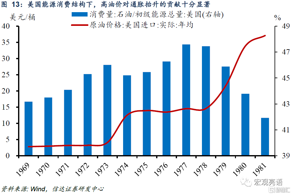 從美國進口的原油價格來看,1981年均價格達37美元/桶,較1970年約3美元/桶的均價翻了十倍不止。原油在美國能源消費結構中佔比最高,1977、1978年佔比均突破47%,高油價對通脹擡升的貢獻十分顯著。
