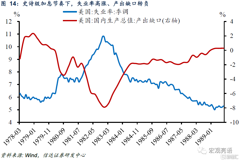 沃爾克上任後,美聯儲祭出史詩級加息對抗通脹,一年內大幅升息700bp,聯邦基金利率升至20%的超高位。緊縮的貨幣政策導致失業率在1980年初升至8%,產出缺口也開始回落,沃爾克短暫降息企穩經濟。面對持續失控的通脹,美聯儲在降息後失業率小幅回落之際再次緊縮,在1980年8月到1981年7月的加息週期中,聯邦基金利率兩次升至近20%,終於打落通脹,CPI在第二輪快速加息的週期中持續走低,加息結束後不久增速已落至10%下方。在沃爾克第一個任期結束之際,通脹率中樞基本降至3%以下,然而史詩級的加息使得美國產出缺口由正轉負,且1980-1988年長期居於負區間,失業率在加息後一度攀升至兩位數,付出了沉重的經濟代價。