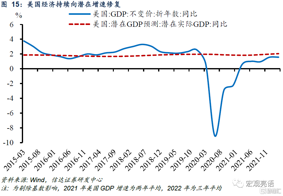 2022年一季度,美國實際GDP環比折年率爲-1.4%,成爲2020年三季度以來的首次負增長。這並非系美國經濟基本面走弱所致,第一,2021Q4實際GDP環比折年率爲6.9%,是2020Q3後的最高值,墊高了2022Q1的環比基數。第二,從同比增速上看,剔除基數影響後的一季度GDP增速小幅上漲,持續向潛在增速靠近。分項上,美國一季度GDP環比負增長主要受到貿易逆差、存貨投資變化和政府支出減少的拖累,三者合計拖累GDP約4.5個百分點。