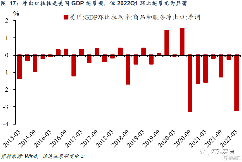 出口疲弱疊加進口激增,貿易逆差成爲GDP環比的最大拖累項。美國作爲世界上最大的貿易逆差國,淨出口往往是GDP的主要拖累項,今年一季度淨出口環比拖累達3.2%,成爲四大分項中的最大拖累。1)進口維持強勢,環比增長17.7%,顯示出美國內需保持強勁;2)出口大幅走弱,環比下降5.9%,主要源於商品項表現疲軟。一方面,歐盟、中日韓等美國主要貿易夥伴在一季度分別受到俄烏衝突和疫情影響,外需放緩。另一方面,美國供應鏈修復存在瓶頸的背景下,爲滿足國內旺盛需求,商品內銷導致出口下降。