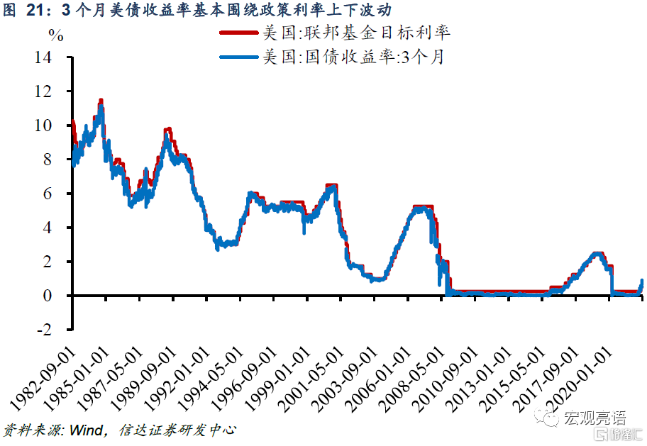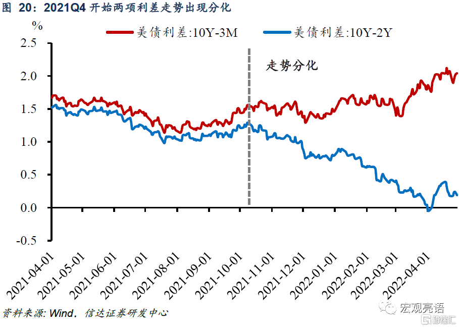 導致兩項利差走勢分化的核心原因是加息預期。3個月美債收益率更多反映加息事實,與政策利率走勢高度擬合,歷史上,3個月美債收益率基本圍繞聯邦基金目標利率上下波動。2年美債收益率不僅包含了短期政策利率的波動,對市場加息預期也更加敏感。2021年9月美聯儲議息會議後,市場加息預期明顯增強,一方面FOMC經濟預測調高了通脹預期,另一方面加息點陣圖所顯示的加息時點提前、幅度加大。11月美聯儲“通脹暫時”立場出現退讓,12月放棄“通脹暫時”論,美國通脹數據不斷刷新歷史新高,進一步強化了市場加息預期。可以觀察到,2021年10月起2年美債收益率快速上行,3個月美債收益率則表現平穩,維持在0.05%上下。2022年以來,美國通脹繼續升溫,市場加息預期大幅增強,導致美債10Y-2Y利差快速收窄直至倒掛,而美債10Y-3M利差反向走闊,4月末已達200bp以上。