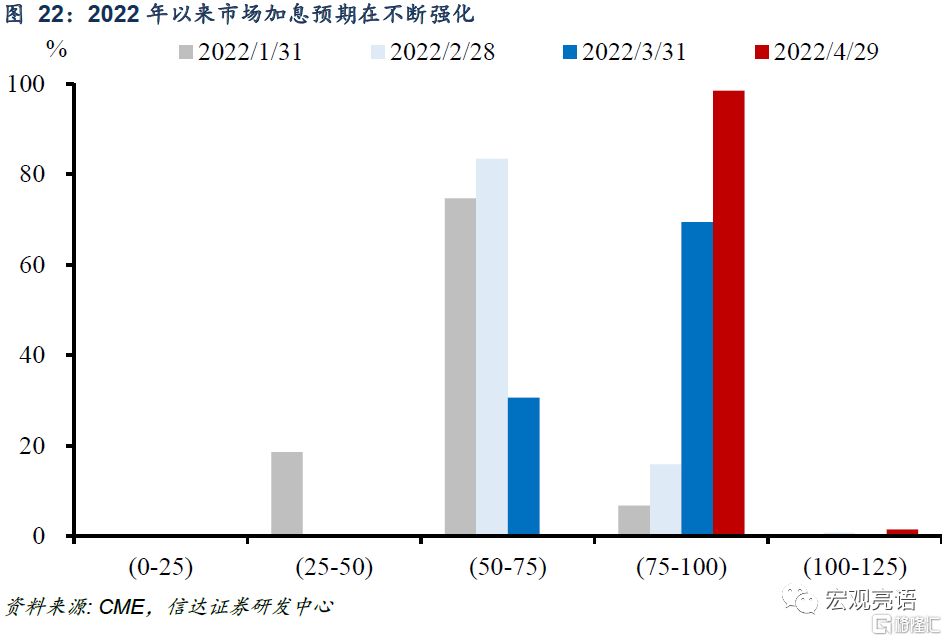 第一,美國通脹正處於四十年以來的最高方位,工資-通脹螺旋已經形成,短期內美聯儲緊縮節奏難以改變。在運輸阻滯和勞動參與率低等突出問題並存的局面下,美國所面臨的高通脹並不是短期現象,需要花費長時間、大力氣才能扭轉。5月議息會議上美聯儲如期加息50bp,接下來的會議上,還有可能多次加息50bp。