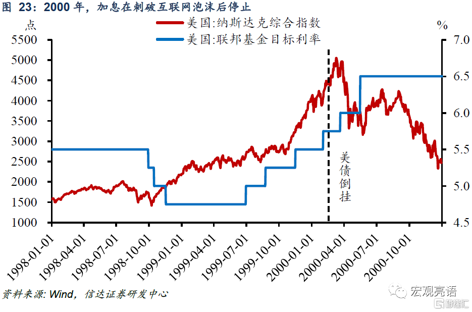2)2000年:1998-2000年受亞洲金融危機影響,美聯儲政策態度多次變化。1998年美聯儲先是降息緩解亞洲金融危機對美國金融體系的衝擊,期間美股迅速上漲。1999年美聯儲判斷經濟開始過熱隨即啓動加息,直到2000年初股市依然延續強勢表現,隨後美聯儲加快加息步伐。面對越來越鷹派的聯儲,市場對經濟預期轉向悲觀,2000年2月美債利差倒掛,此時納指來到互聯網泡沫的最高點。2000年5月美聯儲一次性升息50bp,互聯網泡沫被刺破,美國經濟前景黯淡,美聯儲在倒掛出現的3個月後停止了加息。