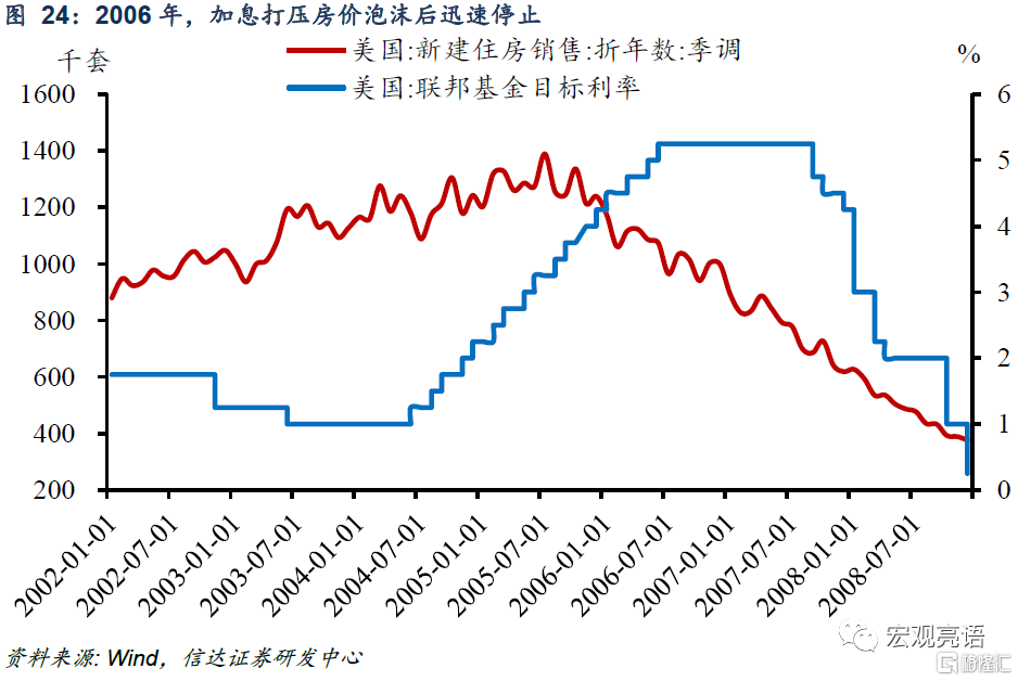 3)2006年:2004年聯邦基金利率處於歷史低位,房地產市場蓬勃發展,大量資金涌入房市,美國產出缺口收窄、通脹開始升溫。2004年7月美聯儲開啓加息,貸款利率的擡升使得居民住房需求開始走弱。2006年6月,在加息400bp之後,美債利率出現倒掛,此時房市已經明顯降溫,全美房市量價齊跌,經濟增長也開始放緩,美聯儲隨即停止加息。