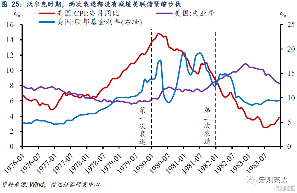 但在高通脹時期,經濟衰退未必會影響美聯儲政策態度,沃爾克時期就是最好的例證。1970年代佈雷頓森林體系瓦解爲超發美元鬆綁,兩次石油危機引發大宗商品價格高漲,疊加多年的擴張性財政政策,美國通脹率屢屢突破10%。爲此,美聯儲幾度將政策利率提升至20%附近,不惜損害經濟來對抗通脹。加息週期中,美國經濟兩次出現衰退,但都沒有減緩美聯儲的緊縮步伐。