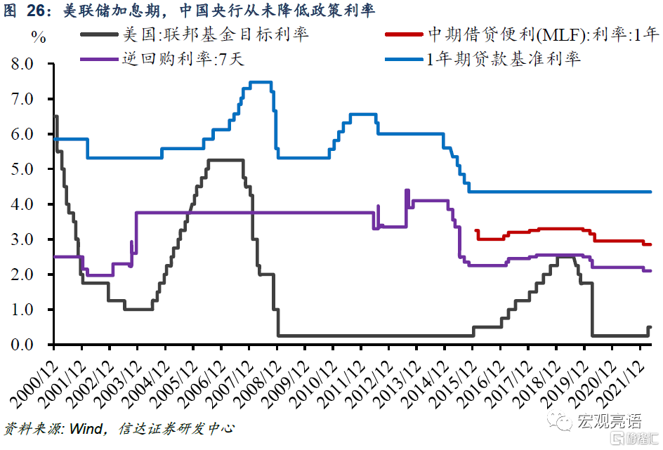 歷史上,在美聯儲加息期,中國央行從未降低政策利率。20151024,中國央行雙降存貸款基準利率,20151217,美聯儲開始加息,這是中國降息距離美國降息最近的一次,距離兩個月。