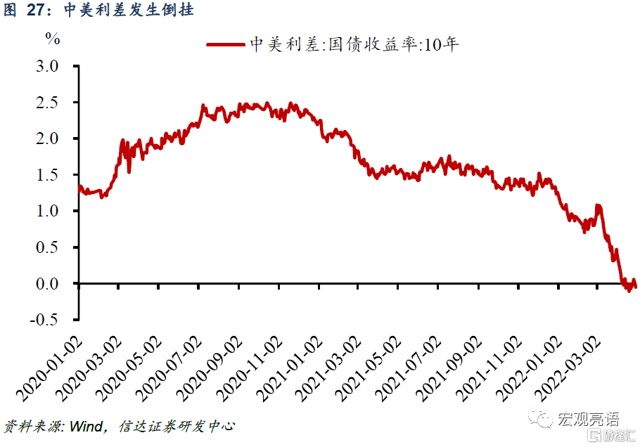 美聯儲加息驅動中美利差倒掛,中國央行如若再降息,利差將承受更大的收縮壓力。受美國通脹續創新高、市場加息預期不斷強化的影響,2022年以來十年期美債收益率快速上升,驅動中美利差收窄。2022年3月加息落地以來,美聯儲高官多次發表鷹派講話,引導加息預期進一步發酵,4月11日中美利差發生了近十年以來的首次倒掛。美聯儲加息期內中國央行有能力“以我爲主”,但採取寬鬆操作尤其是降息通常較爲謹慎。當前中美利差仍倒掛,央行若再降息,利差收縮壓力加劇,或造成更多資本外流、加速匯率貶值預期的形成。