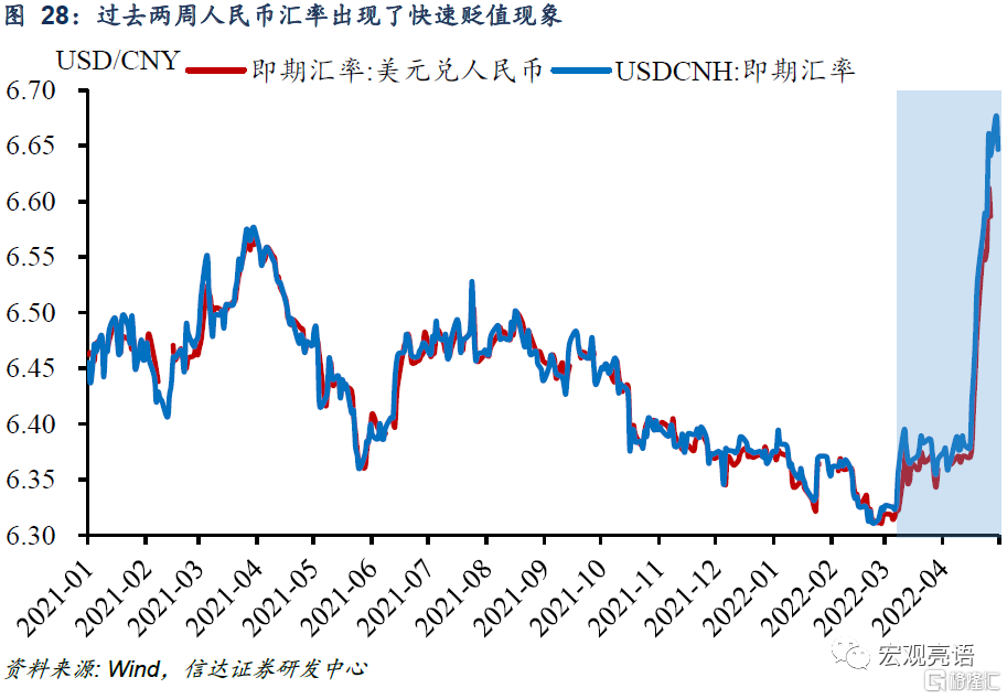 近兩週人民幣匯率出現了快速貶值跡象。4月20日在岸匯率貶破6.4關口,21日破6.45關口、22日破6.5關口、28日破6.6關口。這幾個整數關口接連告破,十個工作日內貶值幅度達到2417基點。離岸匯率的貶值幅度更大,5月2日一度逼近6.7的關口,對市場上人民幣匯率貶值預期產生了重要影響。