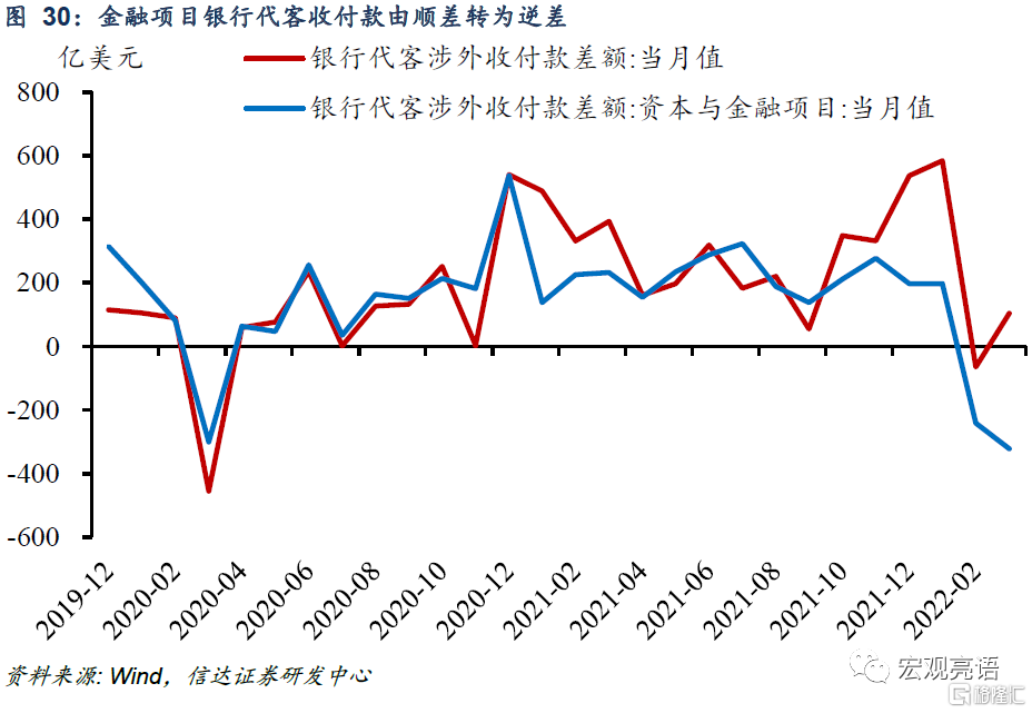 二是2022年以來資本外流壓力增大,資本流動方向扭轉。過去兩年我國對外資吸引力增強,直接投資順差增加、證券投資維持順差。2022年以來資本流出壓力加大,多項高頻指標均顯示出資本外流跡象。從銀行代客收付款差額上看,2月份資本與金融項目由順差轉爲逆差241億美元,3月份逆差進一步擴大至322億美元。在中美利差持續收窄的背景下,中國國債對於外資吸引力有所弱化,3月債券通境外持有量顯著下滑,中央結算公司與上清所口徑數據合計減少1125億元。股市資金同樣面臨流出壓力。